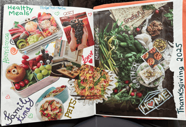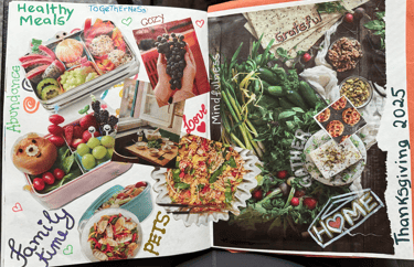 Lastly, my 2026 collage made specially for this post with all delicious, vegan, earth, heart felt food we can eat for thanksgiving and year round. Added some words with markers for a final touch!